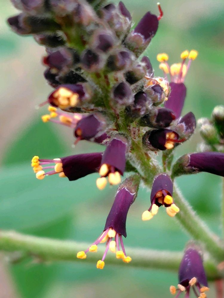長さ6〜20cmの黒紫色をした穂状花序を付ける。