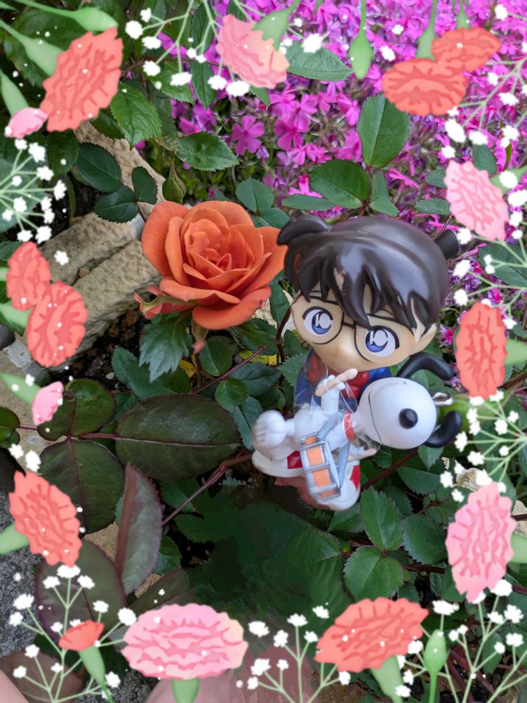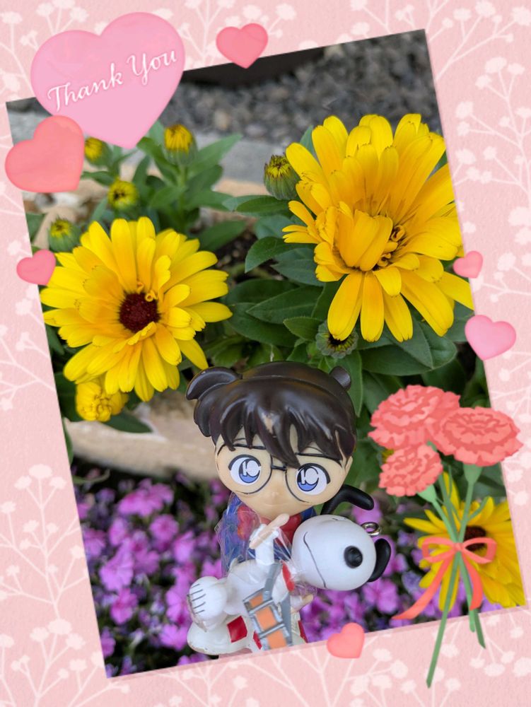 スヌーピーとコナンで一緒に花壇を見てまわりました♡