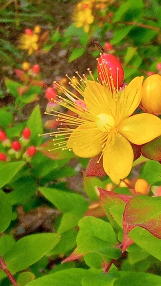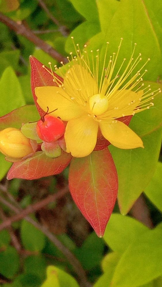 褒めていただき、ありがとうございます😊 明るい黄色の花💛とドングリみたいなトンガリ坊主の赤い実🔺が可愛くて、好きな花です。