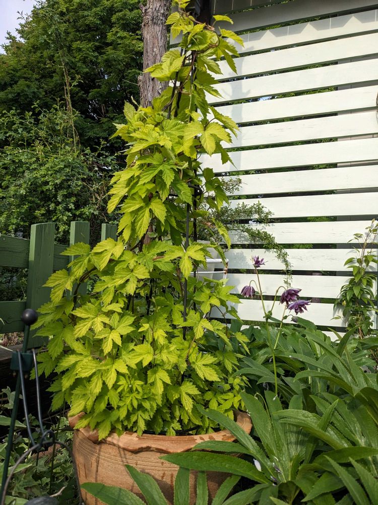 4⃣ホップ 黄緑色の葉が庭のポイントですが、水切れに弱くて💧今年は元気に育てたい あとお花見たことないけど咲くのかしら…雌雄異株ってネットで見たけどこの子はどっち??