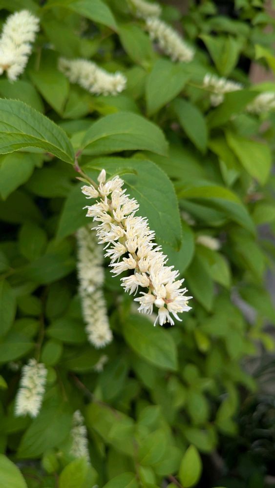ブラシ状の花序で、ほのかに甘い香りがある小さな白い花をたくさん咲かせます。また、紅葉を観賞するため各地の庭園に植栽されたとのこと。