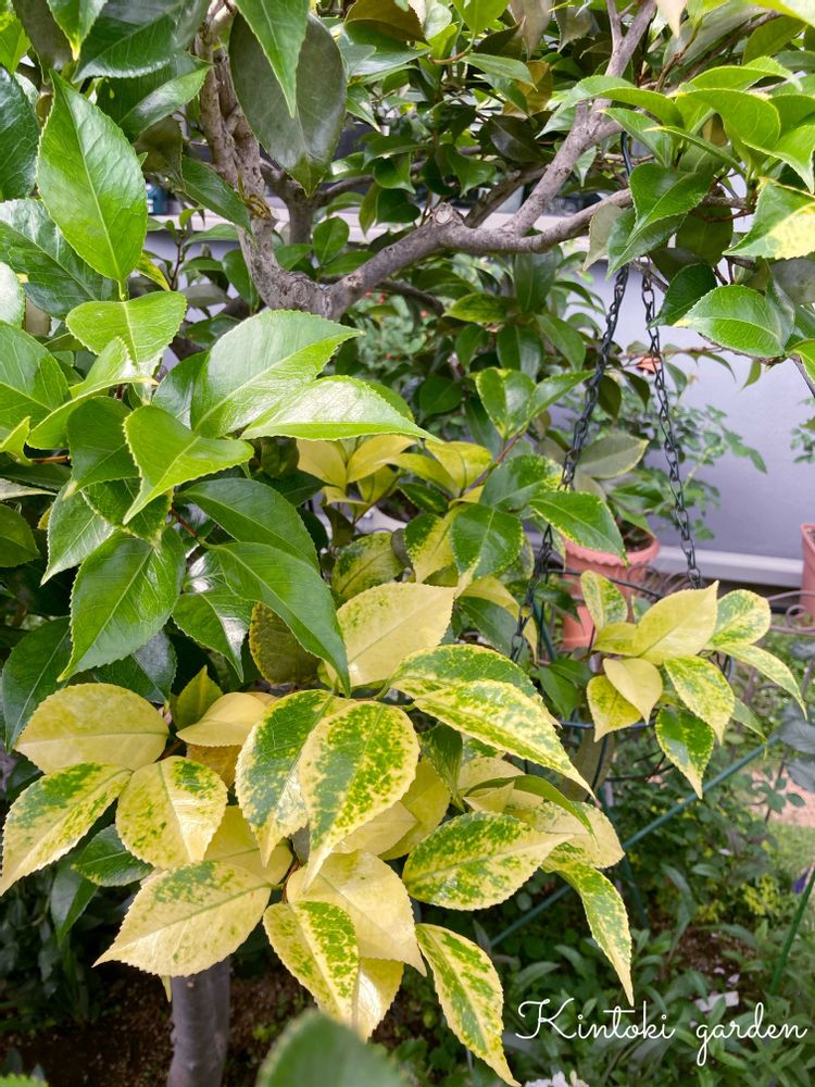 最後の葉はツバキ太神楽です春先に鳥達に花を啄まれてしまいますが新葉のこの時期斑入り葉が眩しく輝いていました。