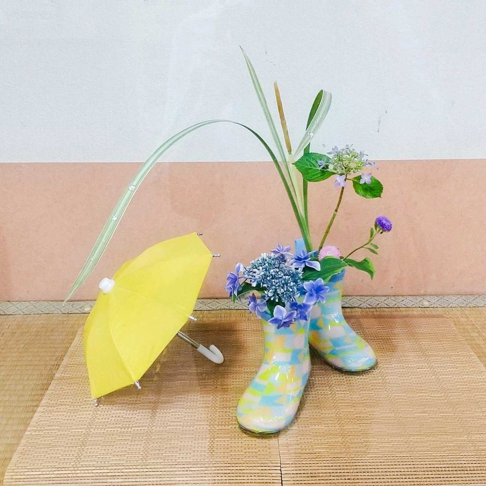 今日は本当に一日中雨だったので、いけばなを見て少しでも気分がスッキリしてもらえたらうれしいですね☂️🌈