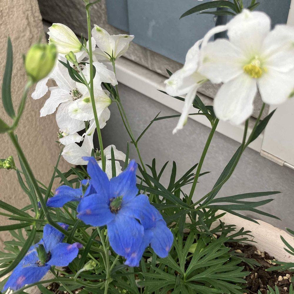 決して同じタイミングでは咲いてくれないデルフィニウム チアブルーとチアホワイト。