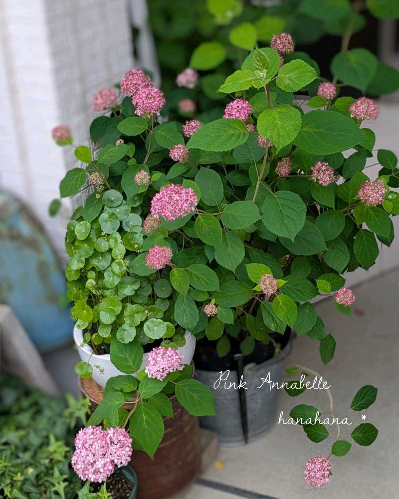 ①②ピンクアナベルが咲き始めました💗今年は置き場所を玄関入り口付近に変えてみました。一番手前に見える子は昨年挿し木で殖えた子です。