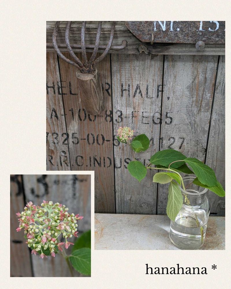 ④昨年挿し木したピンクアナベル。蕾がついた枝が折れてしまいダメ元で瓶に挿しておきました。頑張って咲いてくれました🩷