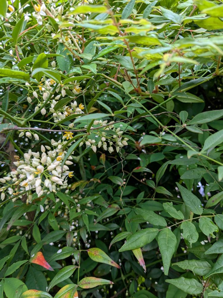 南天の花。少し剪定しないと、増えて、先が見えなくなってきます。🤔