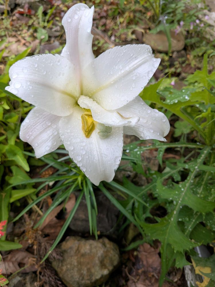日陰で伸びたいけど伸びるの諦めたのでしょう。テッポウユリ