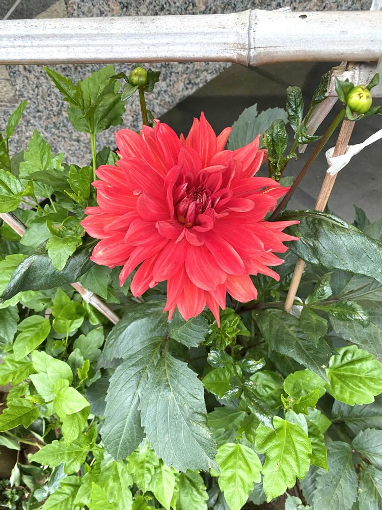 近所の花壇に真っ赤で大きなダリアが開花中❤️