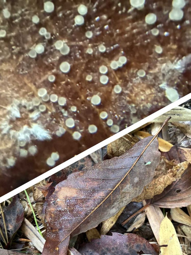 木がたくさん生えてる山や森の傾斜の下の方でチラチラと太陽光が当たって枯葉の堆積が十分にありその枯葉の下の方は十分湿ってるようなところでその枯葉を割り箸とかで上から捲ってみると葉の裏に変形体や変形菌が着いています。