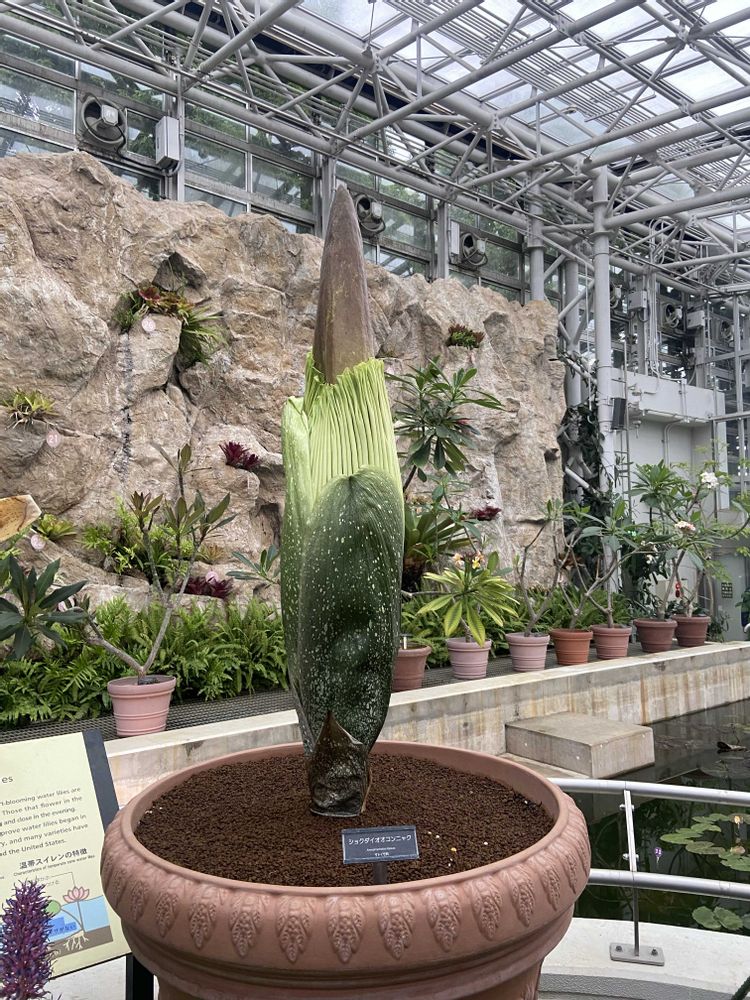 ショクダイオオコンニャク、夜間公開へ行った😆開花した夜悪臭を放つという、世界一臭い植物、臭くないじゃんと思っていたら苞から流れ落ちるような臭いが漂ってる‼️臭い👃