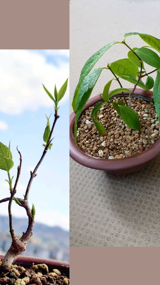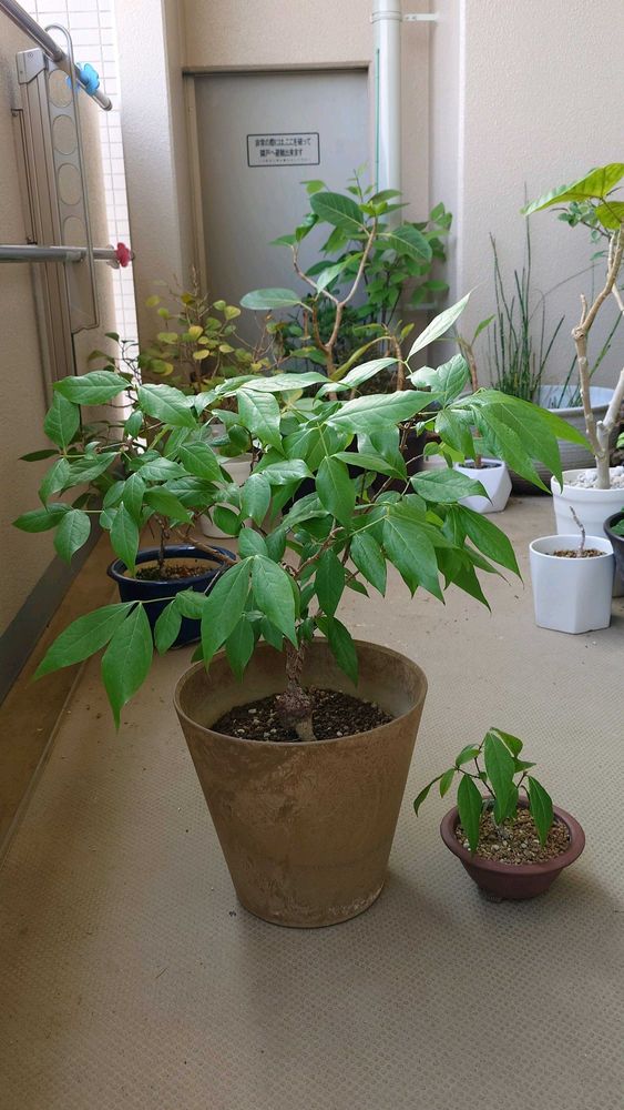 ① 左 鉢植えの低木。右 盆栽。同じ年に発芽したとは思えぬ大きさの違い。
