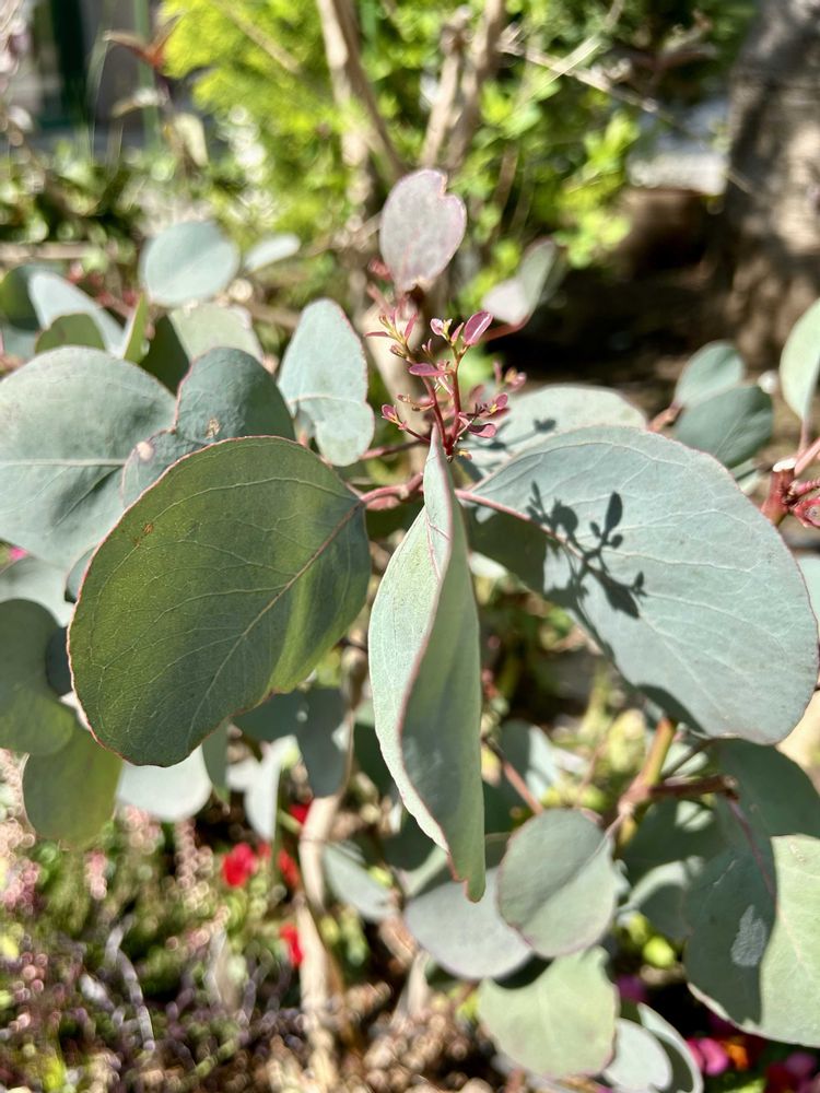アウトドア用品の店の前の花壇のユーカリポポラス。💚ハートリーフ。03月22日☀️陽がだいぶ春めいて来たかしら。先っちょのもしゃもしゃは新芽?場所:武蔵野市吉祥寺南町