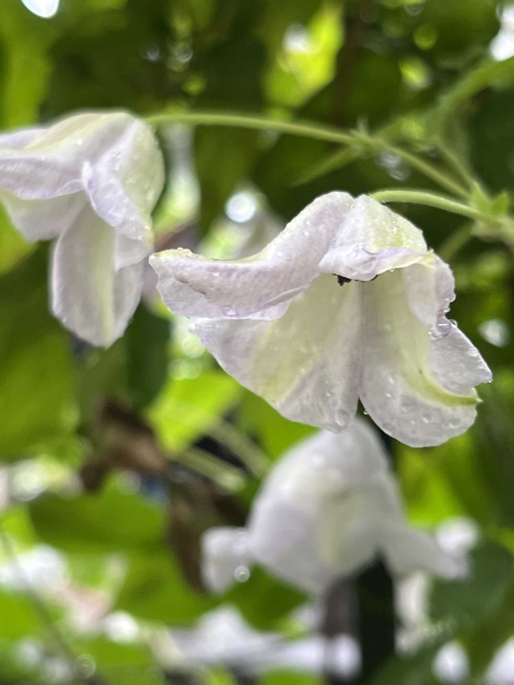 うつ向きの白い花弁の弁先にグリーンが混じり、その花弁がよじれたようになる