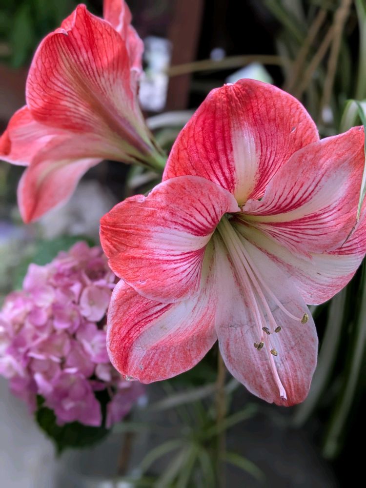 お友達に貰った綺麗なアマリリス紫陽花と花瓶に生けると…凄くゴージャス🎵🎶💕