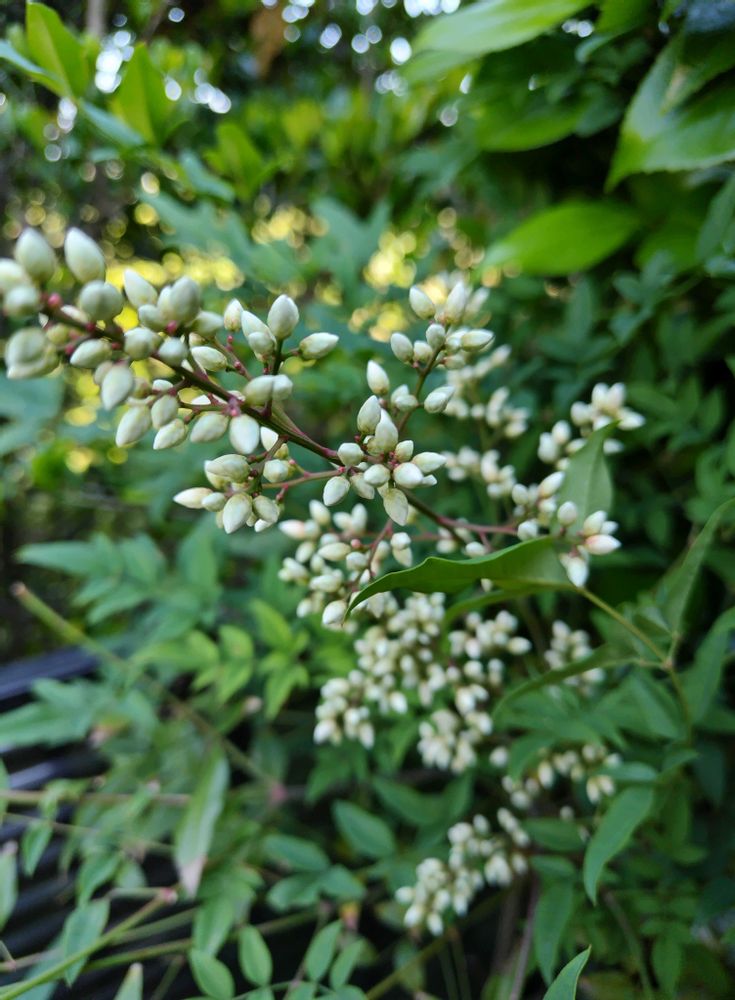 ②南天の実は目立つけど、花はさりげなく咲いています。