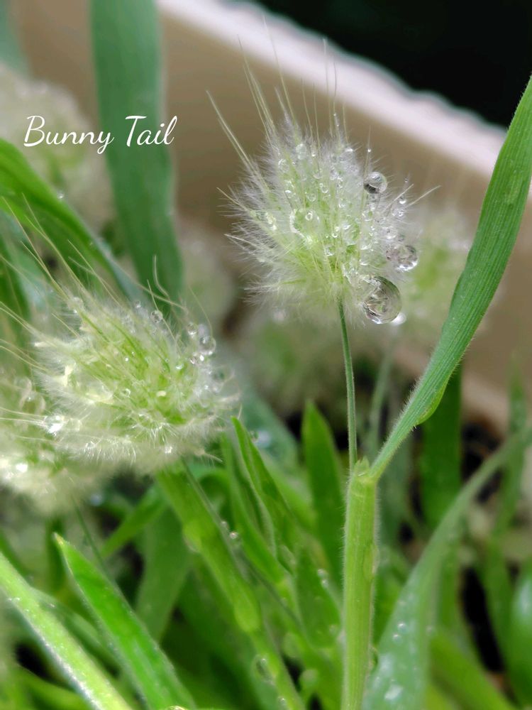 昨日の激しい雨で、水滴をいっぱいつけたこぼれ種からのバニーテール🌿