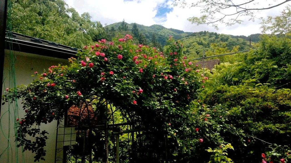 庭のつるバラ「アンジェラ」の一番花の開花を確認してから約3週間経ちだいぶ開花が進みたくさんの花がつきました。