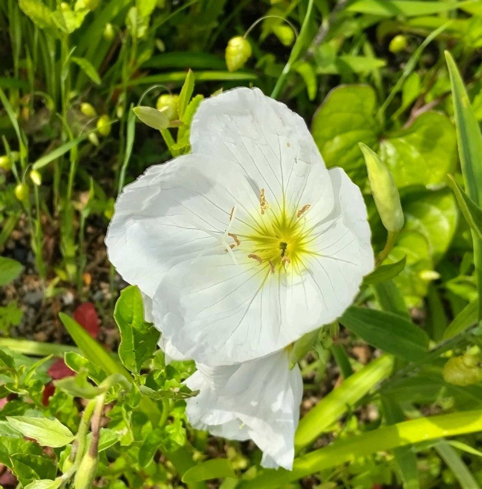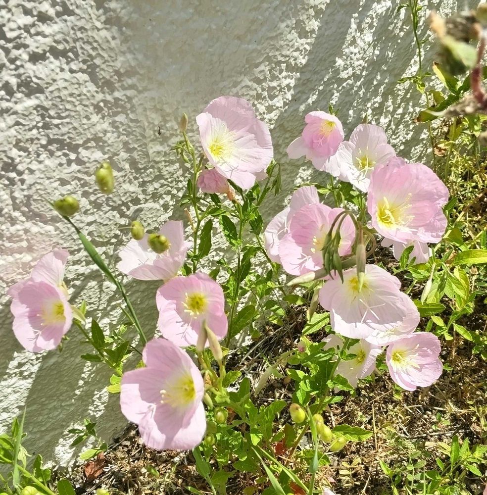 歩道脇にある手入れのされていない花壇の中でヒルザキツキミソウが咲いていました❣️