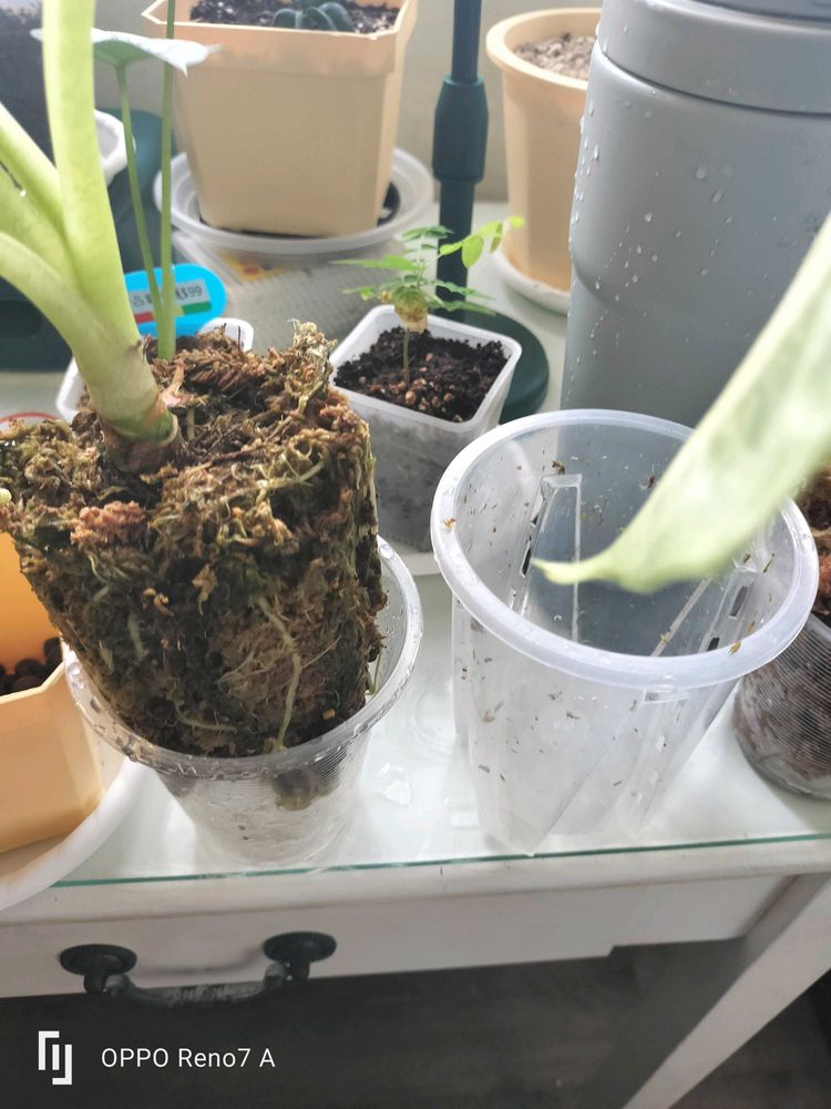 アロカシアの根がつまり欠けてたので一回り大きい鉢に植え替えました、がまさかの芋が出来ていたので、株増やししようと思います♪