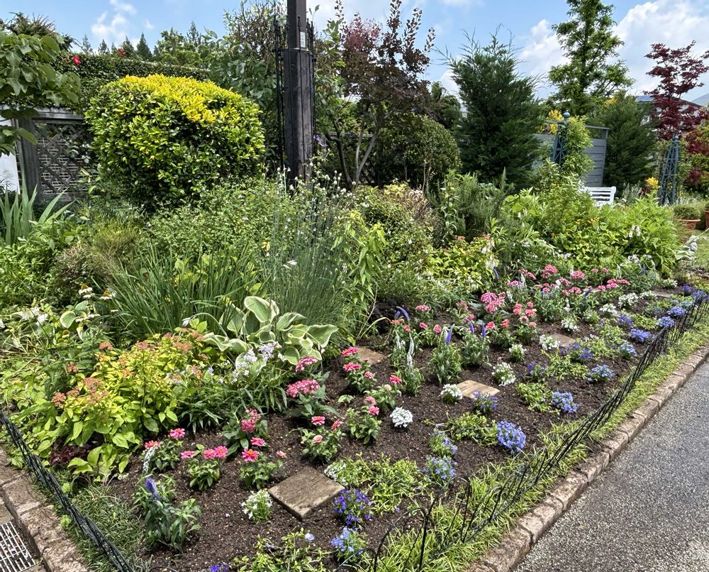 スーパートレニア、ロベリア、ジニアペンタス、ベロニカ、フロックス、種蒔きしたヒマワリ