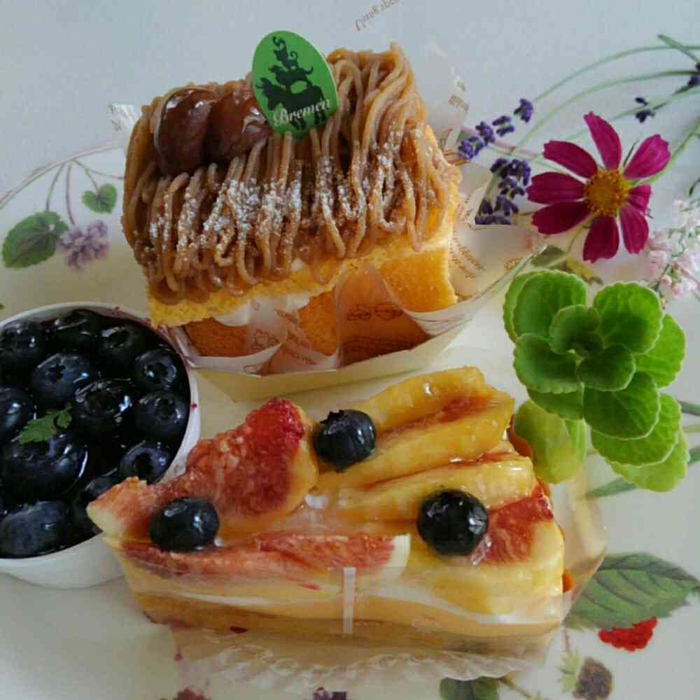 栗のシフォン♪ ブルーベリーのブラマンジェ♪ イチジクのタルト♪ 自作ではありません💦念のため😄