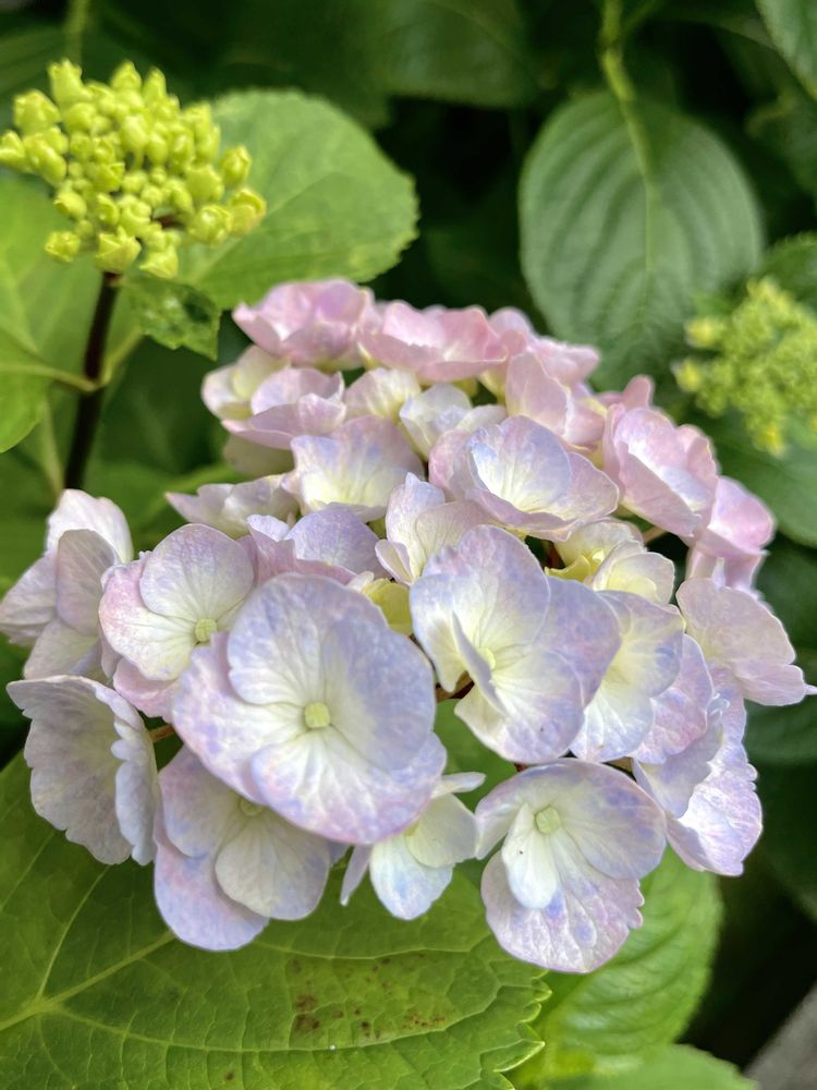 黒軸紫陽花💠マクロフィラ・ゼブラフラミンゴ(ブラックスチールシリーズ)今年は中間色(?)淡い虹色にも見えます🌈✨