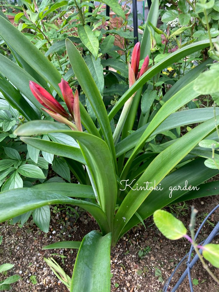 バラの一番花が終わり又赤い芽がアーチのバラ早咲きマリーヘンリエッテなど目立って出始め初夏の花アマリリスも負けじと立派な葉と花を咲かせました。