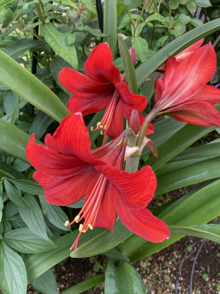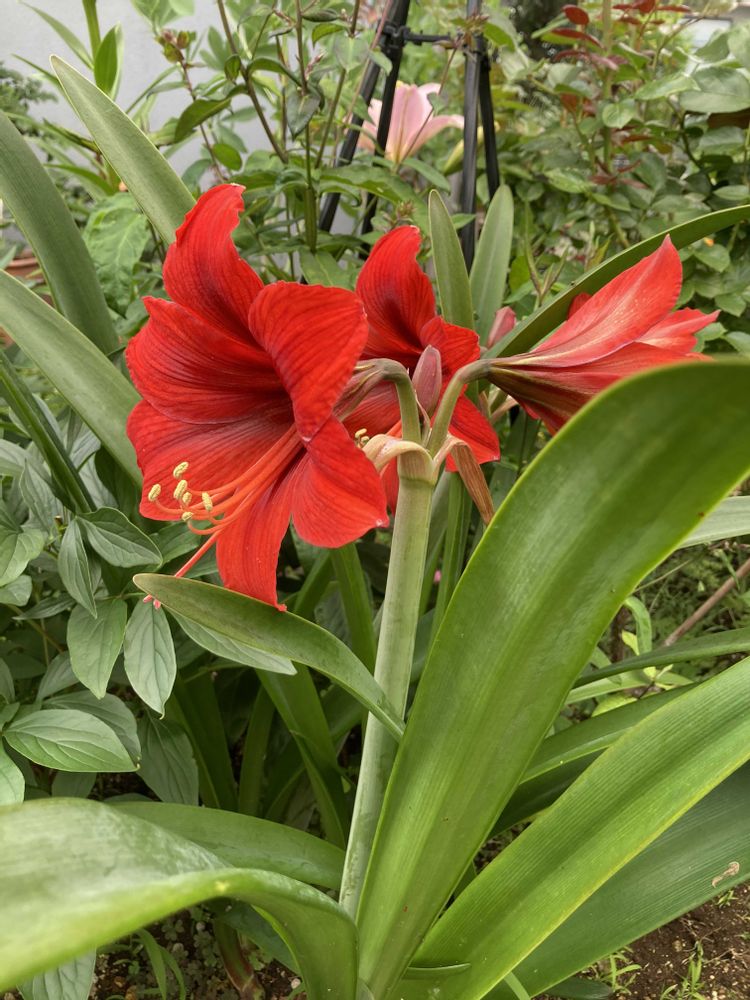 今日もアジサイをアップしようと思いましたが、あまりにも勢いよく咲き始めた真赤なアマリリス 頑張って蕾みを付けました手前にオルレアがあって隠していたので水仙タリアの植っている場所なので、オルレアにはサヨナラ👋🏻してもらい今朝のアマリリスです。