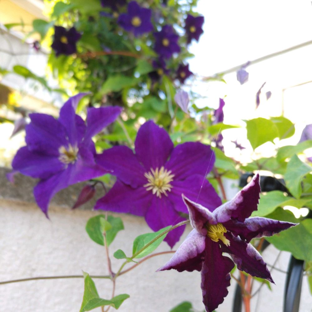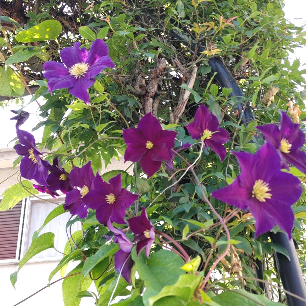 クレマチス ビオラです。モッコウバラのアーチにからませています。