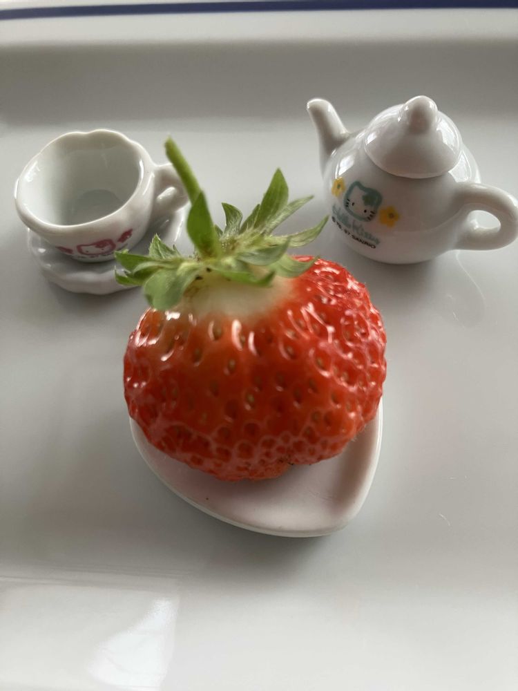 イチゴの収穫も最終かな デモ 今までで一番大きな子です ミニチュアとの対比ですが 大きーいよー