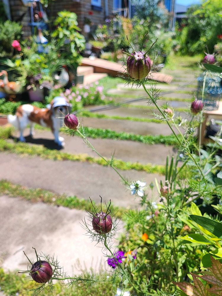 本日は快晴なり。暑いです。モモに帽子かぶせて庭に解き放ち葉水やって来ました。ニゲラが種になってきています。