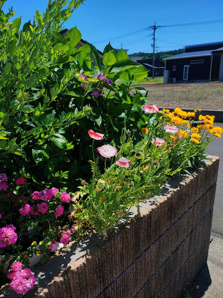まだなんとか頑張ってくれてるポピー。コレオプシス、バラ プチシャンテ、アジサイと。萩もそろそろ咲くかな~。