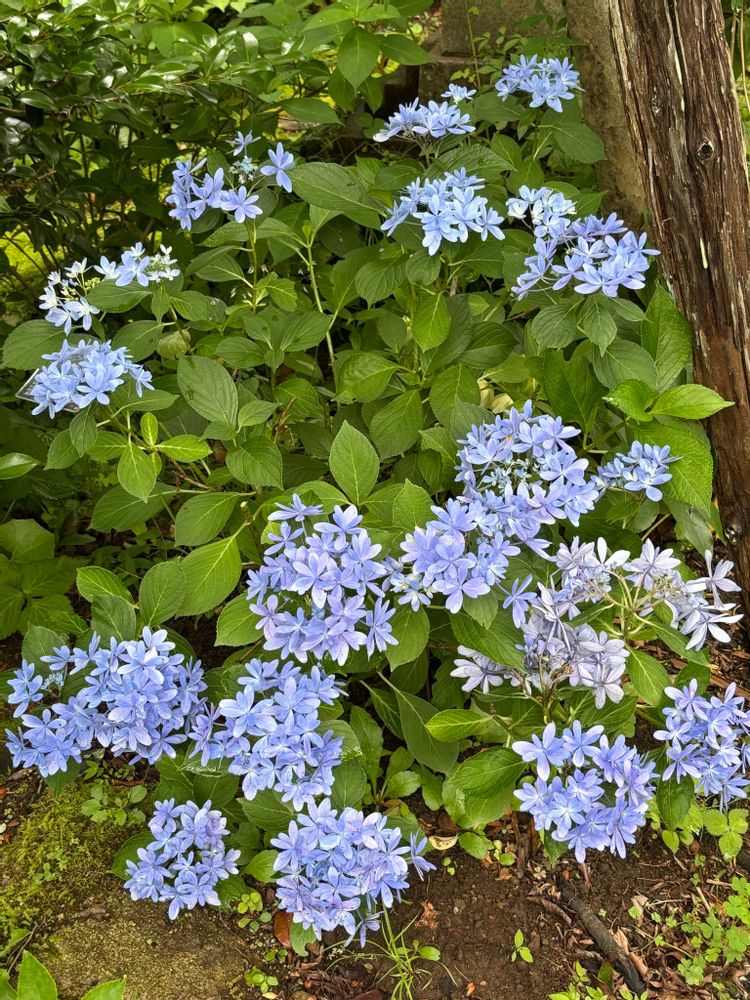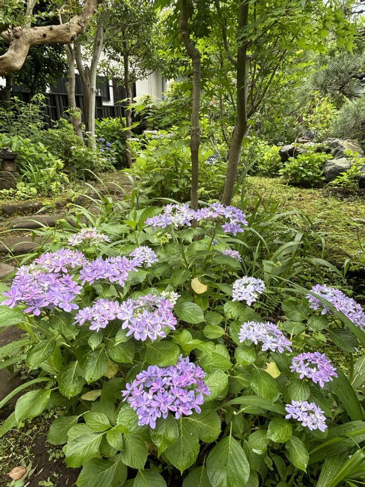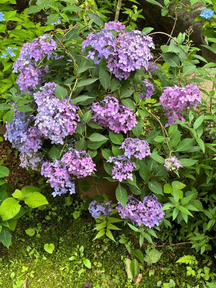 古民家のお庭に山紫陽花や加茂セレクションの紫陽花が咲いています