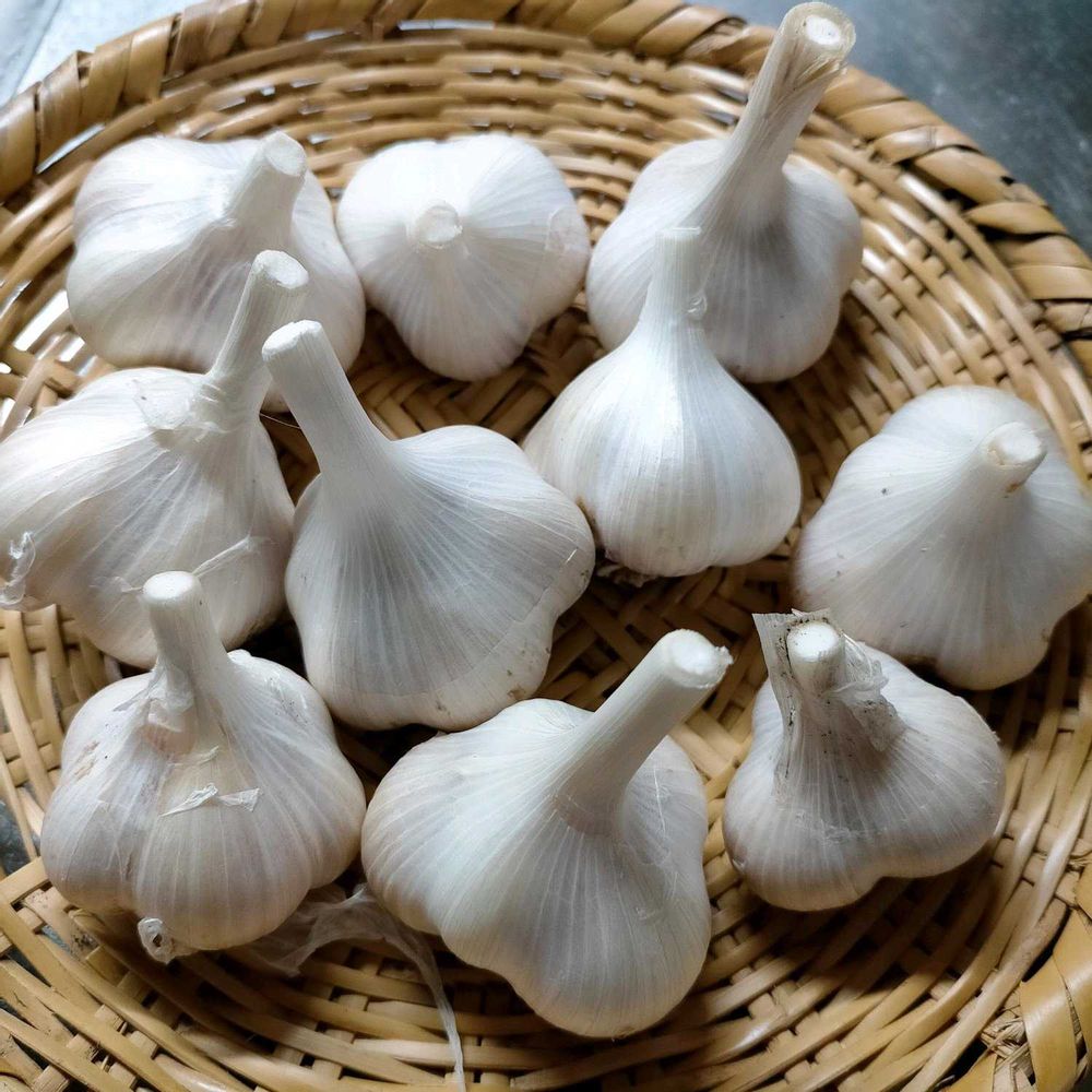 9月くらいにホームセンターなどでニンニクをバラした一片がたくさん入った種ニンニクというものが売っていますが、うちは食用ニンニクでやっています。すごく大きな食用ニンニクが秋に農協直売店で売ってるんですよ。直径8cmくらいの😚 一片にすると立派なチューリップくらいあって、それを2年連続で植えています。スーパーでも立派なニンニクに出会えればそれを植えても👍 芽が出ちゃったニンニクを植えている方もいるみたいですよ🤭