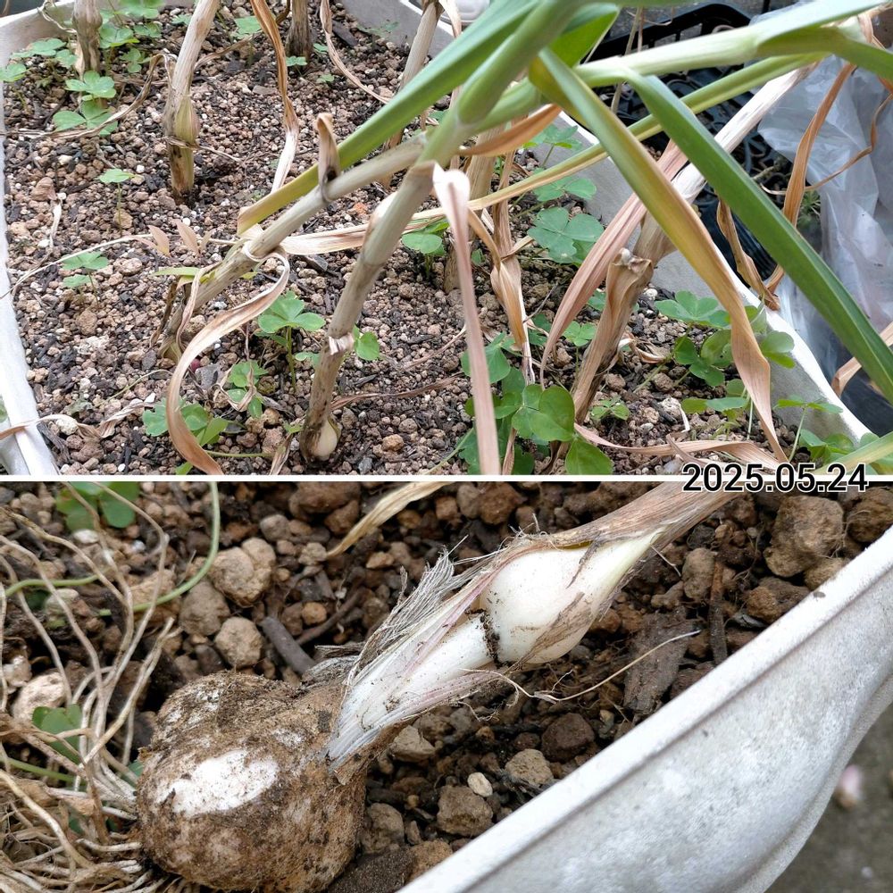この花芽が茎の中で止まっている状態、農家さんのYoutubeで見ましたが、主に最近の気候が原因らしいです。春早くにふわっと暖かくなり花芽が形成されるも、その後また真冬の気候に戻り、そのまま伸びずに終わっちゃうみたいです。そうすると花芽に栄養が取られてニンニクが太れないみたい😢 出来ることはあまり深植えしないことくらいのようでした。