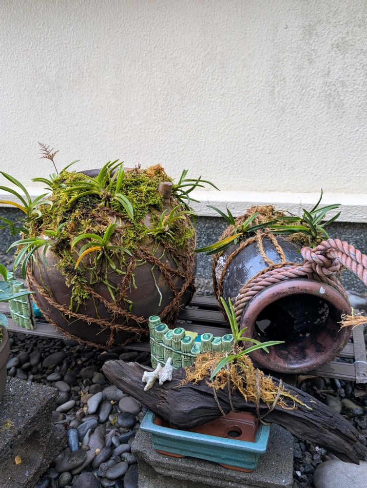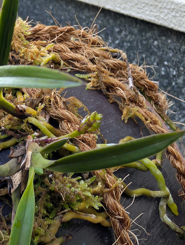 こんばんは☺️以前の投稿からの定期便です💌大切な花友さんから頂いた風蘭ちゃんと壺付けの風蘭ちゃん達💕花芽が出て来てめっちゃ嬉しいです🌸毎日の根の伸びが楽しみでしたが花芽の観察も加わりました💓