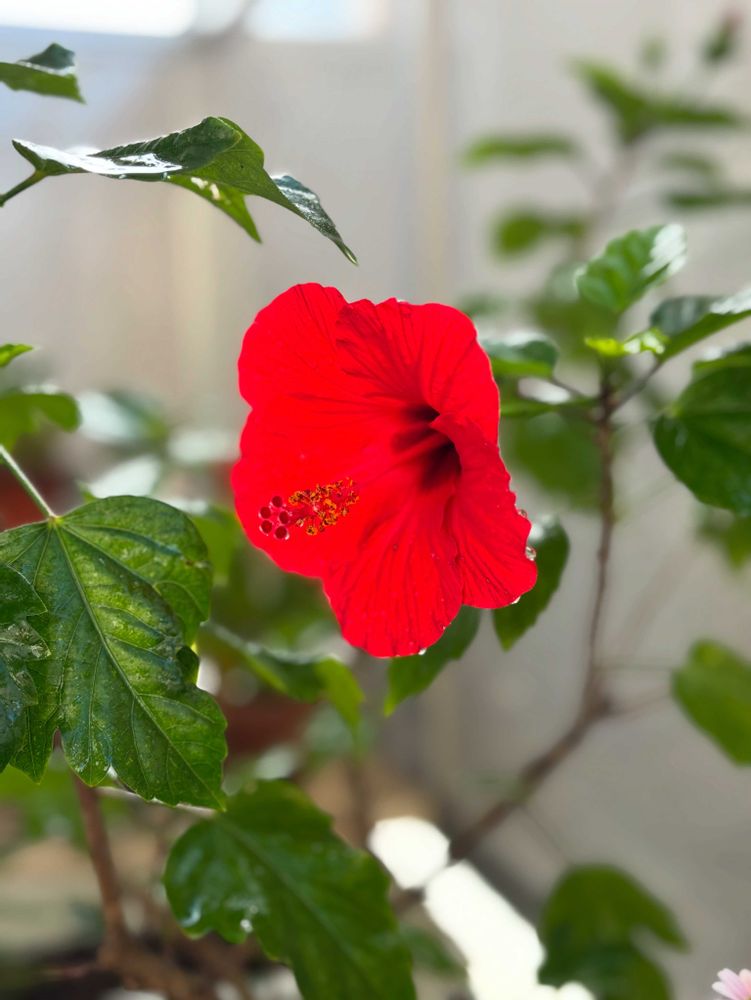咲きました❣️今年の一輪目🌺美しい朱色に惹きつけられます✨