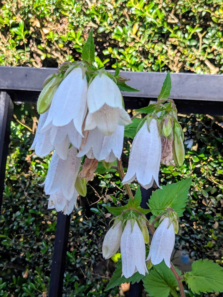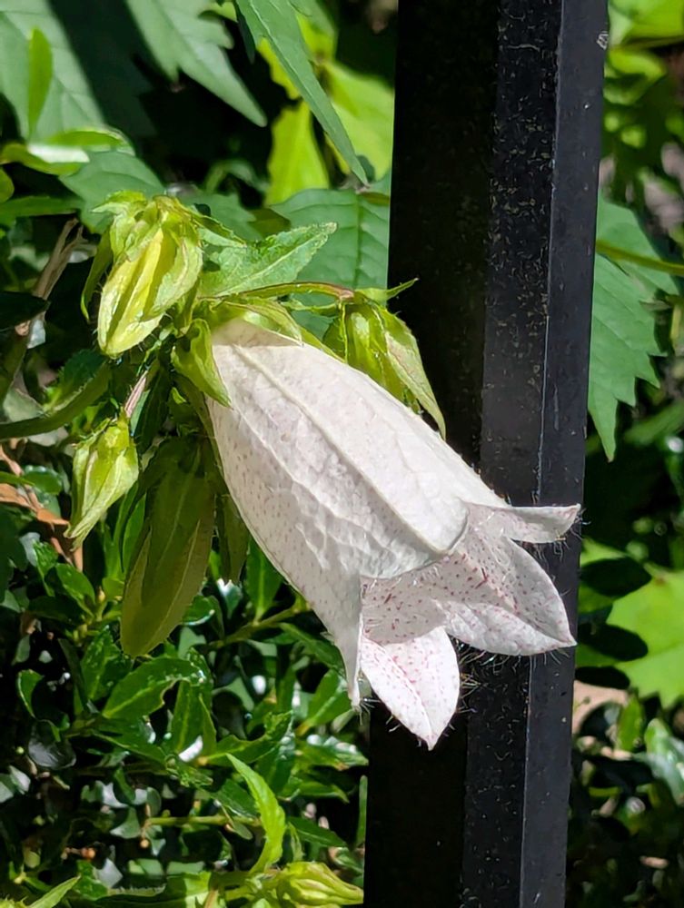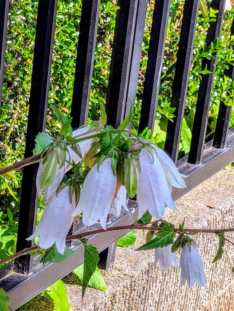 いつもの散歩コースを外れ違う道を歩いてみたら柵を越えて咲いているホタルブクロに遭遇🤍✨