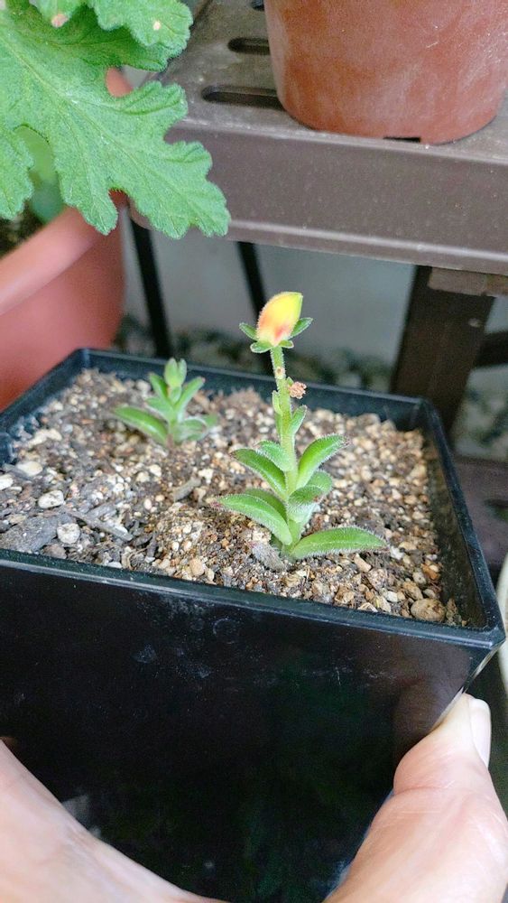 立地的に陽射しにバラツキがあるので、徒長しやすいなぁ…とションボリしていますが、紅輝炎の子株に黄色いモノが…👀