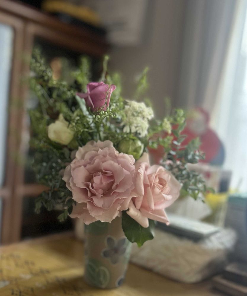 薔薇育て歴2年です。庭で育てた薔薇、レースフラワー、&道端に咲いていたぺんぺん草?で、グリーンブーケを作ってみました。全くの独学?なので、笑ってやってください笑