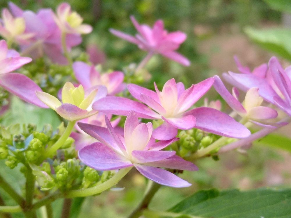 緑の蕾と装飾花のピンクが対象的な感じでニンマリしてるよ・:*:・(*˘︶˘*).。*💚🩷・:*:・