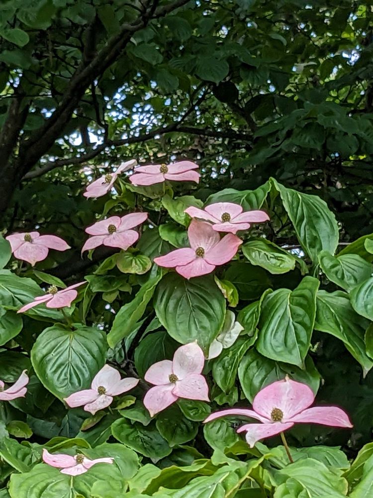 艷やかな葉が、ヤマボウシのピンク色を引き立ててますね🌿