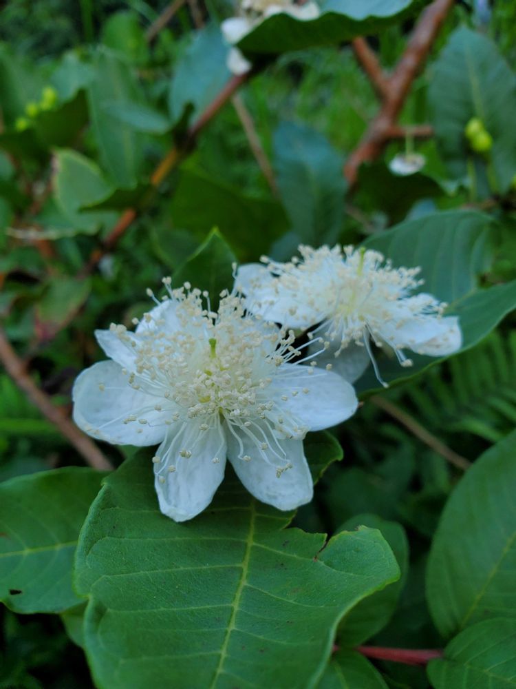 沖縄から送って頂いた大実の白いグアバと、タキイさんの四季咲きグアバの花。お花の形状はほぼ一緒ですかね。いい香りがします。