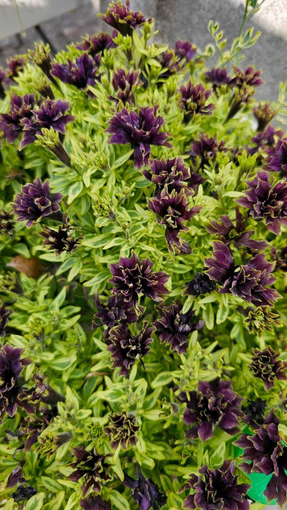 斑入りの葉っぱの爽やかな中にダークな色と変わり咲きの花姿がシックなペチュニア