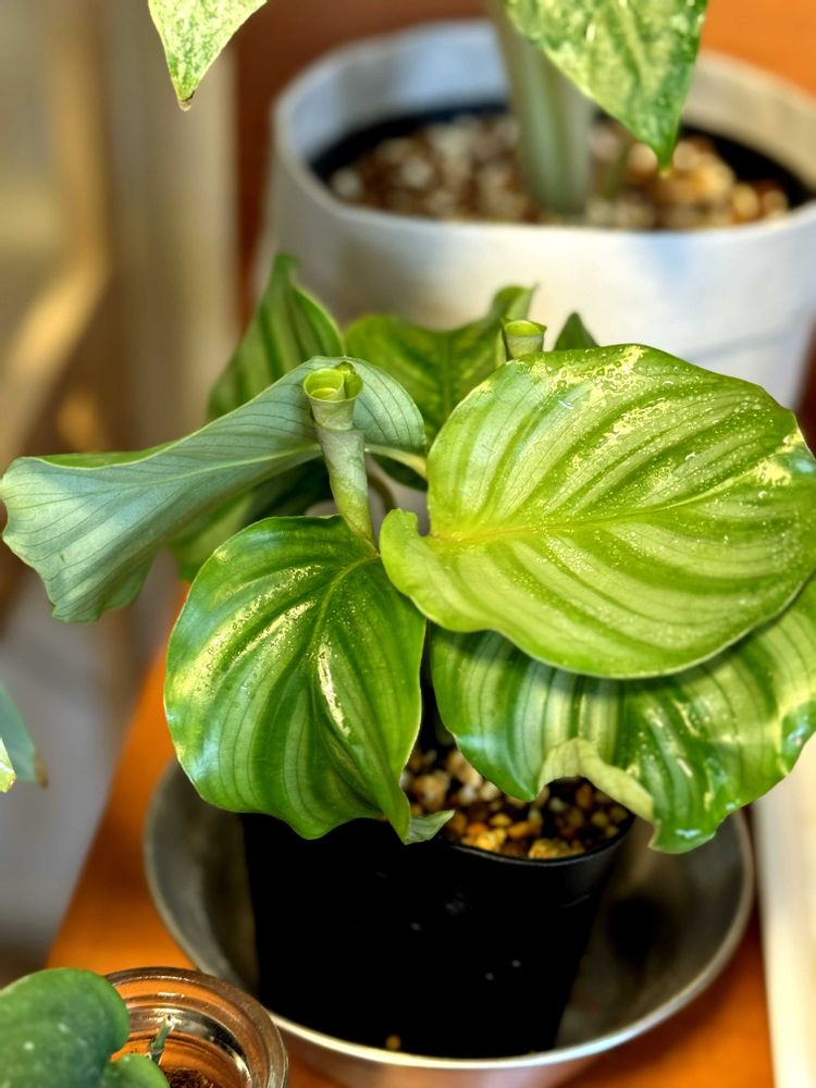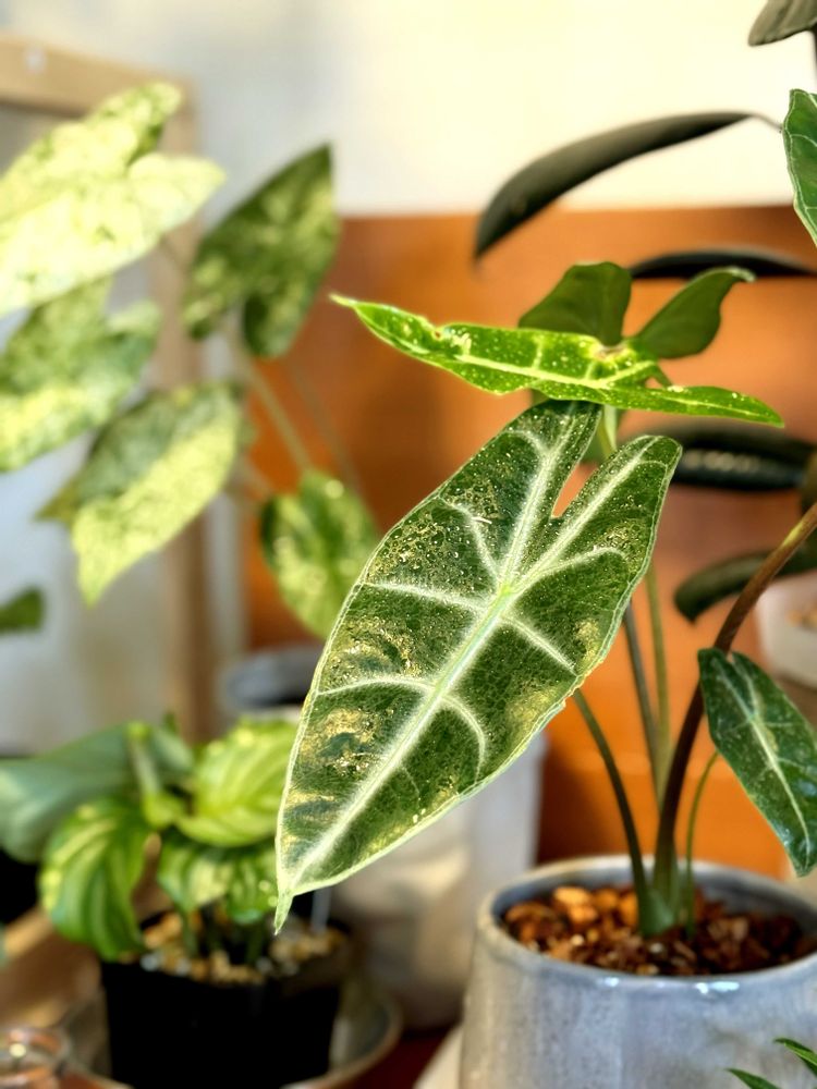2025.8月に某サイトで購入した【アロカシア チャイ】の 突然変異?なんだろう 購入時、元々有った葉を(1枚目の葉)として、 下から新たな葉が出てきてる状態で到着しました(2枚目の葉) こちらに来て初めて出てきた葉に異変が。。 育て始めて出てきた初めての3枚目、4枚目 (途中から、斑1、斑2、、と続きます) どこまでこの謎の斑入葉が続くのか、 いや止まるのか……記録していきます