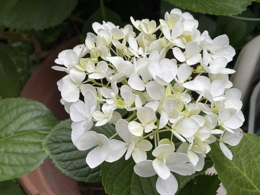 ベランダに咲く白い紫陽花🤍𖤣𖥧𖡼.𖤣𖥧品種不明🤍