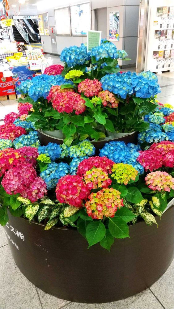 今日は母と2人電車で出かけしました。駅には綺麗な紫陽花の植木鉢が並んでいました赤は紫陽花のトルネードという名前みたいで初めて聞く名前でした