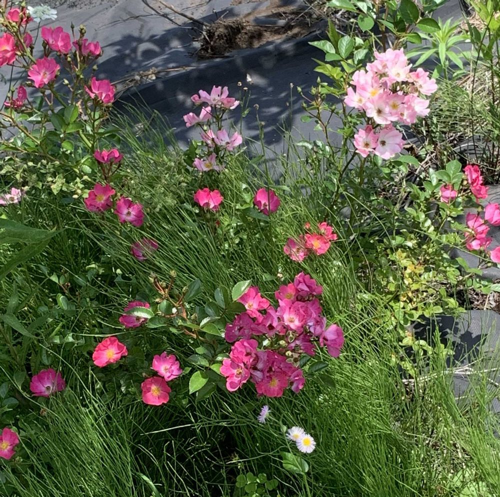 ピラミッドアジサイの根元の除草をしようと庭に出たら,ピンクの花が咲いています。近寄ったらバラでした。😊安曇野さんかなあ❓