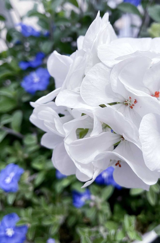 ゼラニウムの純白さを めっちゃ引き立ててもらって、ありがたい👍💙💭💙